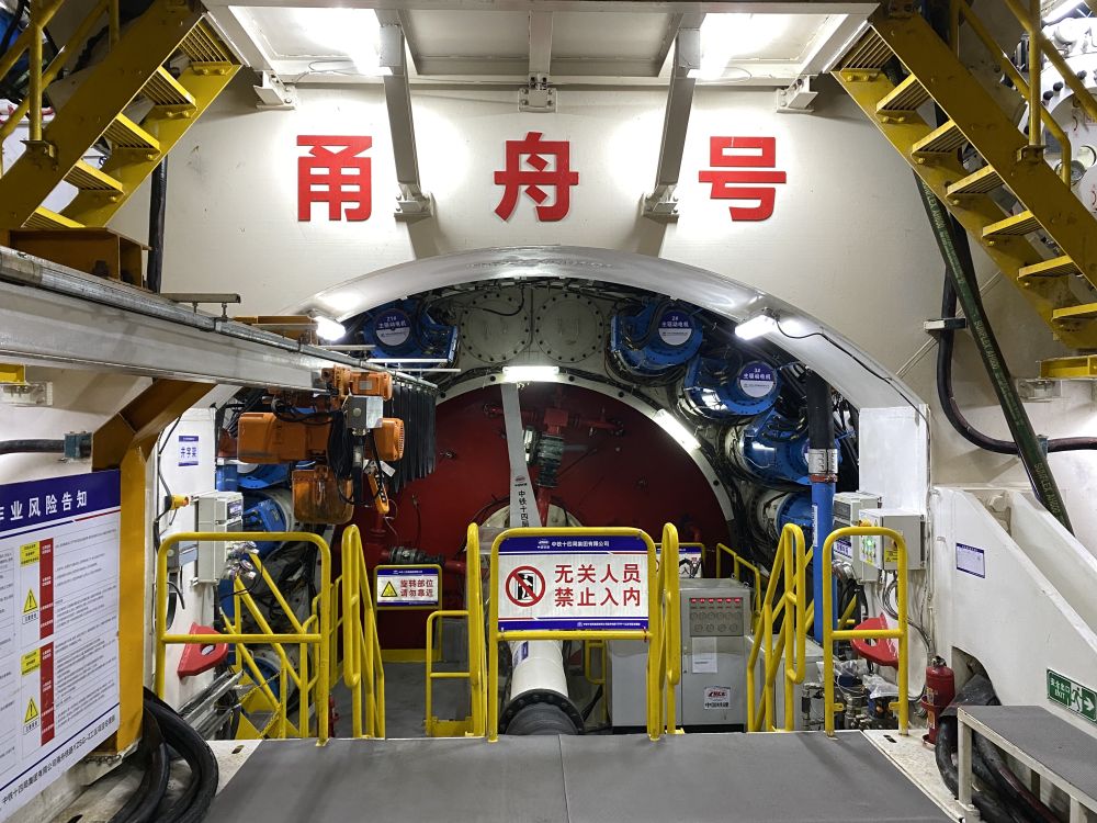自2024年5月“甬舟號”盾構機始發以來,目前已掘進近2400米,深度位於海平面下約65米處。今年5月29日,工程迎來一個重要節點——盾構機由陸域段全面進入海域段施工。