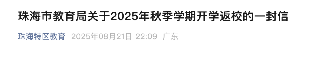 8月21日晚,珠海市教育局發佈關於2025年秋季學期開學返校的一封信。