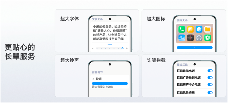 專為老年人羣設計“長輩關懷”功能,支持對字體大小(最大可調至200%)、圖標大小(可調大約10%)、鈴聲音量(最大可調400%大音量)、攔截詐騙電話,攔截廣告推銷電話、攔截房產中介電話、攔截風險應用的調節,一站式調節適老功能,讓老人能看得清、聽得見、不容易被騙。