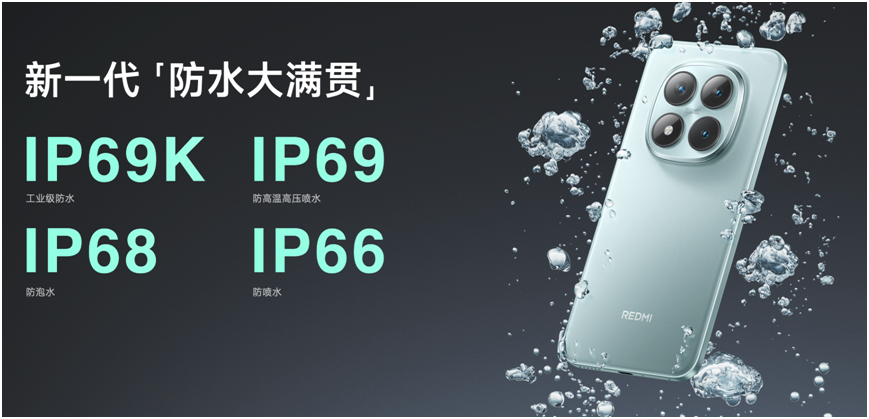 REDMI Note 15 Pro系列的防水性能同樣出色,實現了IP66、IP68、IP69及IP69K防水大滿貫認證。無論是日常淋雨、意外浸泡落水,還是熱水噴淋、高壓噴水,手機都能輕鬆應對。