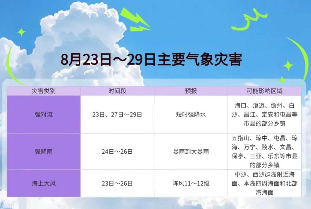 *陸地方面:*8月23日、27日~29日,海南島大部地區有陣雨或雷陣雨,其中五指山以北地區局地午後伴有以短時強降水為主的強對流天氣。