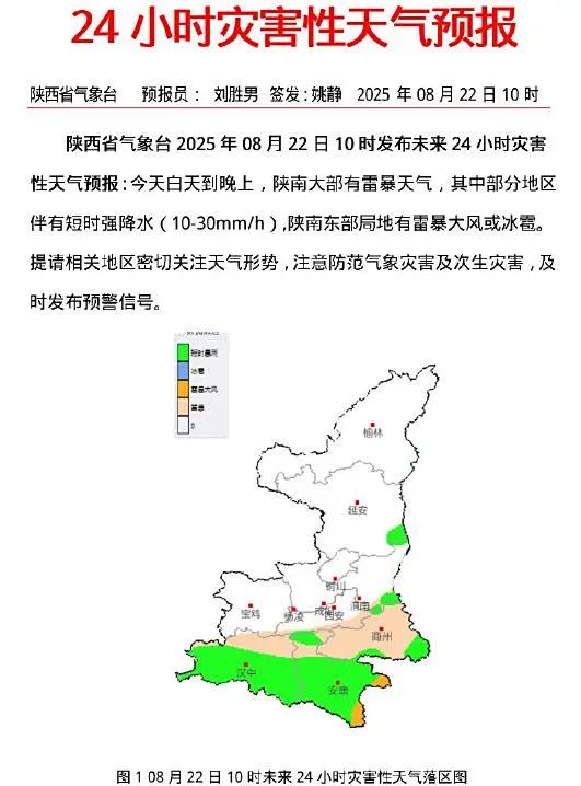 陝西省氣象台2025年08月22日10時發佈未來24小時災害性天氣預報: