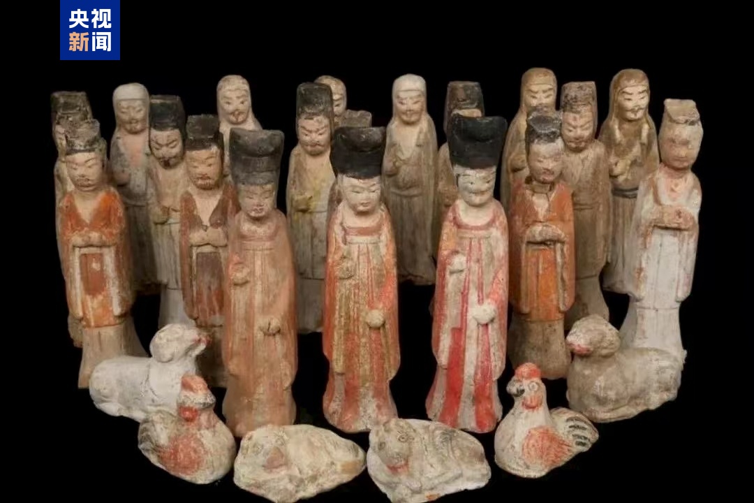 段文振家族墓地雖遭盜掘破壞,但其墓葬結構以及殘留的墓誌、石門、壁畫、玉器、玻璃器和陶俑羣*為研究周隋之際的禮制、官職、文化、經濟及其所反映的朝代更迭、社會變化和門閥制度提供了重要的實物資料。*自段文振墓出土鎮墓武士俑、鎮墓獸、騎馬俑、風帽俑、籠冠俑、動物俑等陶俑共144件,分別出土於壁龕和墓室內,皆為泥質灰陶,表面施彩多中空。該墓隨葬陶俑種類豐富,形態明晰,顯示出較為明顯的隋代晚期特徵。
