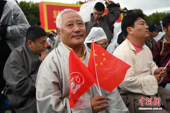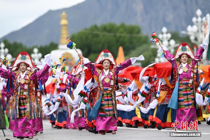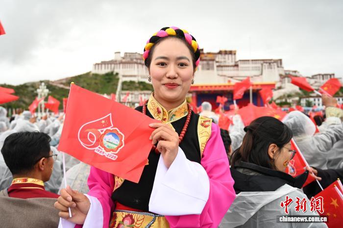8月21日,拉薩古城居民羅桑羣佩在布達拉宮廣場參加慶祝活動。中新社記者 趙朗 攝