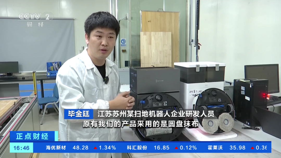 江蘇蘇州某掃地機器人企業研發人員 畢金廷:原有我們的產品採用的是圓盤抹布,它隨着使用過程中它會越拖越髒。我們這台機器採用(的)是滾筒自清潔的技術,它內部還會有一個水箱,在過程中它會不斷清洗滾筒抹布,保證滾筒抹布的清潔。