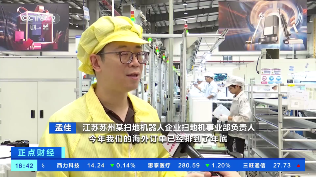 江蘇蘇州某掃地機器人企業掃地機事業部負責人 孟佳: 今年我們的海外訂單已經排到了年底。歐洲是我們(出口)佔比比較大的市場,實現了百分百以上的增長。今年我們引入了非常多的智能製造設備。之前平均生產週期大概在40天,今年我們提升到30天。