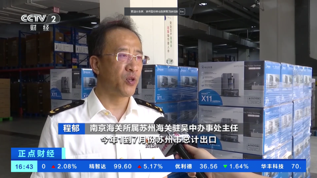 南京海關所屬蘇州海關駐吳中辦事處主任 程鬱:今年1到7月份蘇州市總計出口,包括掃地機器人在內的家電產品5588萬台,同比增長4.2%。