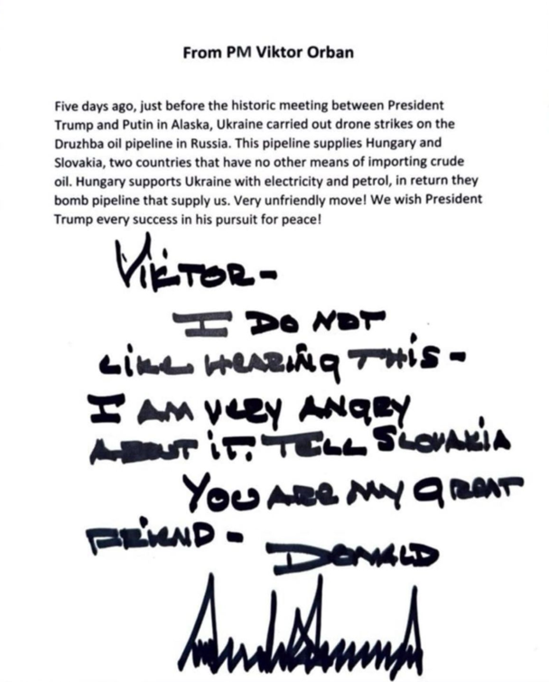 外媒:特朗普給歐爾班手寫回信曝光,稱對烏軍襲擊俄“友誼”輸油管道感到“非常憤怒”