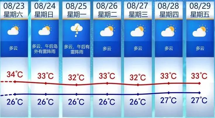 其中,今天的最高氣温在34℃左右