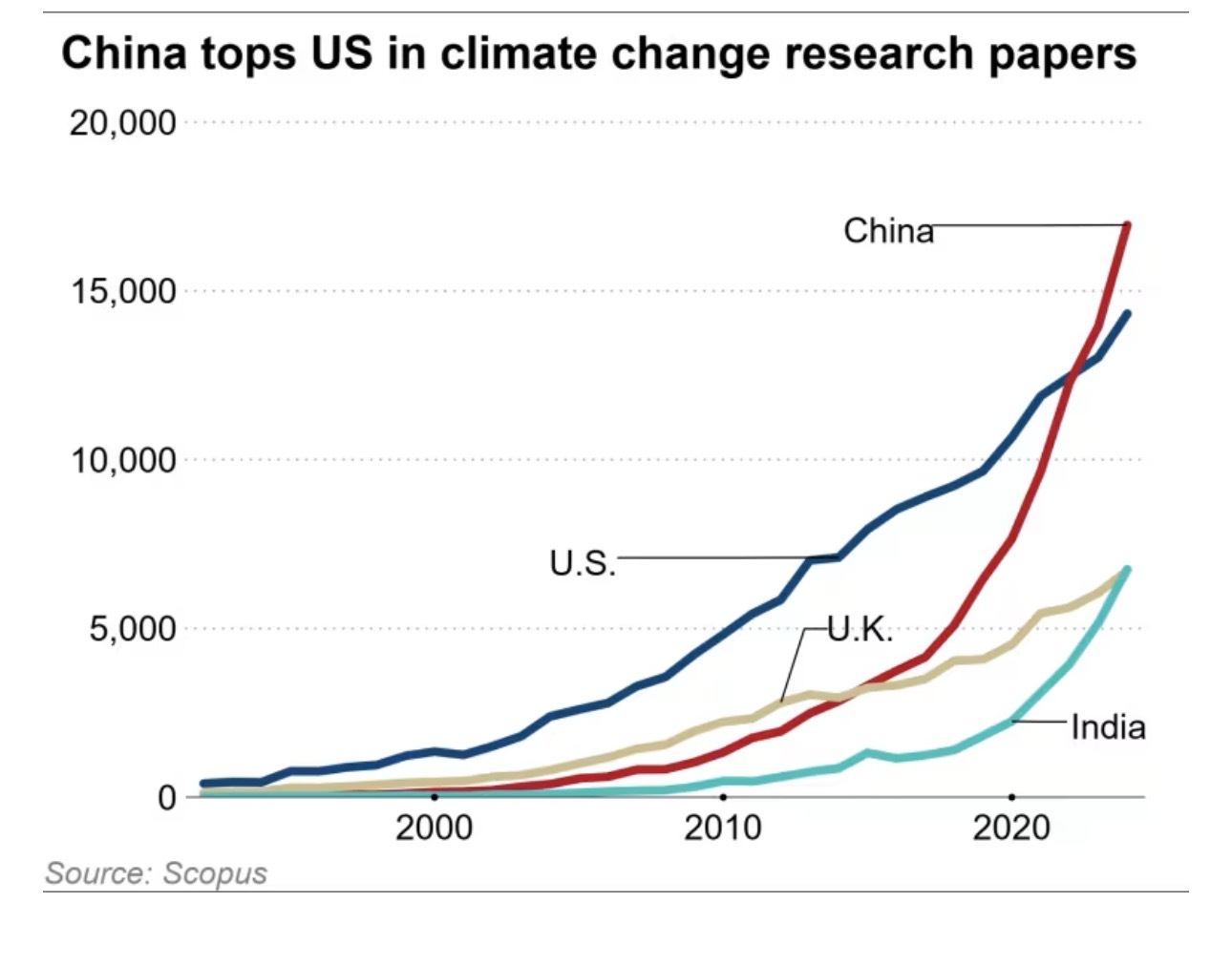 《日經亞洲評論》22日發佈的一篇文章指出,中國在2023年發表的氣候變化研究論文數量超過了美國,並在次年擴大了領先優勢。這一趨勢凸顯了中國全球影響力的持續增長,與此同時,美國卻在逐漸退出這一領域。