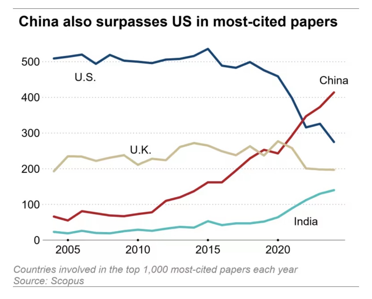 文章表示,中國氣候變化研究論文在其他文獻中的引用次數也在顯著增加——這是研究質量的一個重要標誌。從2004年到2024年,每年被引用次數最多的1000篇論文中,中國在2022年超越美國,佔據了領先地位。