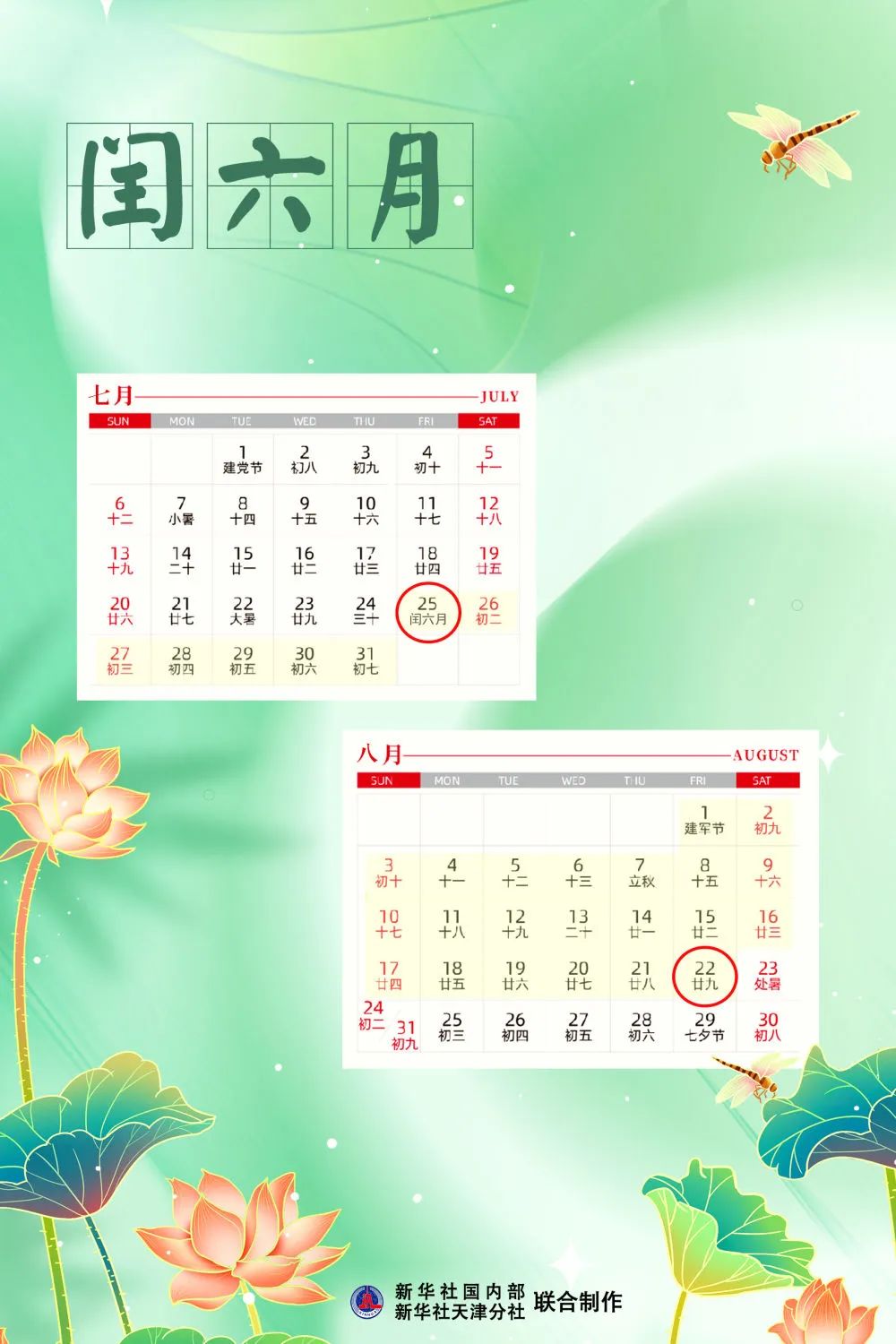 同公曆一樣,農曆也分大月和小月,大月30天,小月29天。今年的閏六月始於公曆的7月25日,止於公曆的8月22日,月長29天,是小月。