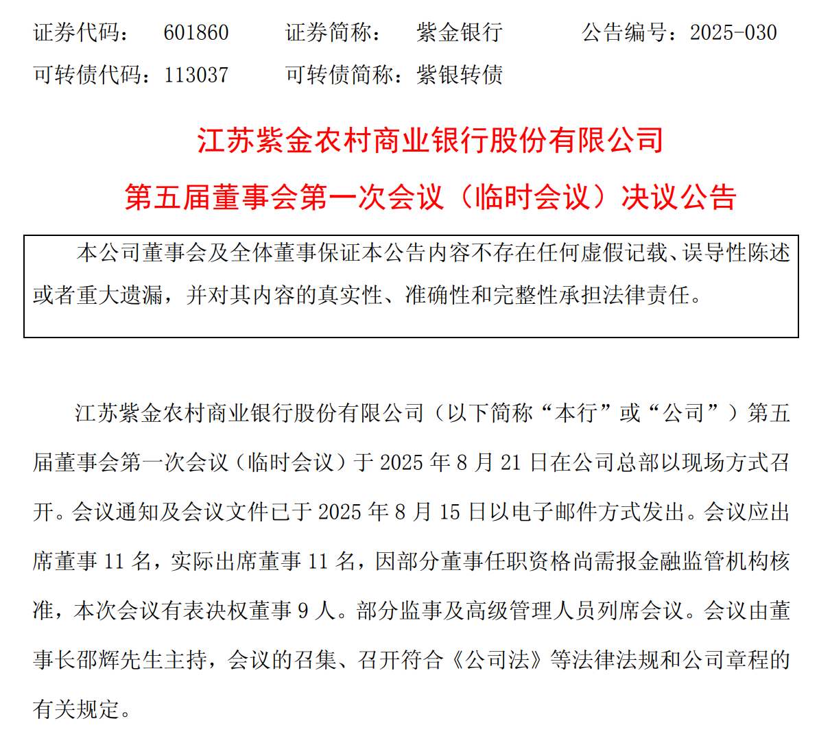 【環球網財經綜合報道】日前,紫金銀行發佈公告稱,該行召開第五屆董事會第一次會議(臨時會議),選舉邵輝任董事長一職。同時,聘任闕正和擔任行長,兼任首席合規官。紫金銀行在公告中指出,在此之前,根據相關監管規定,推選闕正和代為履行行長職責,代為履職期限自此次董事會決議生效之日起,至闕正和行長任職資格獲金融監管機構核准之日止。
