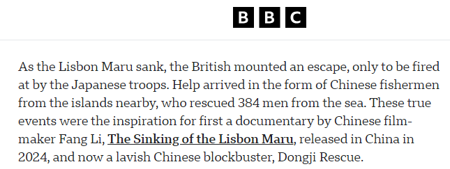 文章最後説,電影《東極島》將於8月22日在英國和美國上映;紀錄片《里斯本丸沉沒》目前正在英國通過奧德賽中文電影頻道網站播放,以紀念中國人民抗日戰爭暨世界反法西斯戰爭勝利80週年。