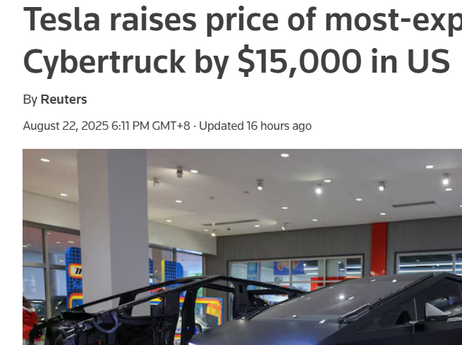 【環球網科技綜合報道】8月23日,據外媒路透社報道,儘管Cybertruck皮卡銷量未達預期且多次召回,日前卻仍宣佈在美國市場將旗下最快版本的Cybertruck車型價格上調1.5萬美元。