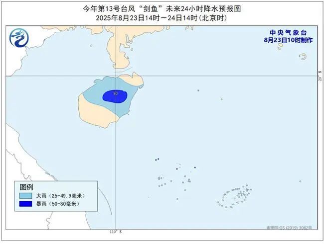 中央氣象台8月23日10時發佈颱風黃色預警:*南海熱帶低壓已於今天(23日)上午加強為今年第13號颱風“劍魚”(熱帶風暴級)。*預計,“劍魚”將以每小時25公里左右的速度繼續向西偏北方向移動,逐漸趨向於海南島南部沿海,強度將明顯加強,預計最大強度可達颱風級到強颱風級(13~14級,38~45米/秒),24日傍晚前後將在上述沿海擦過或登陸,25日上午逐漸趨向越南中北部沿海。