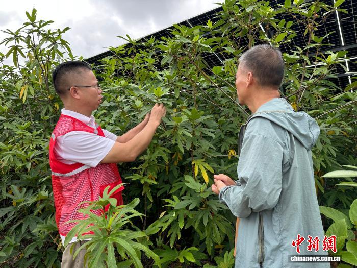 烈日下,光伏板下温潤小氣候讓五指毛桃長得格外舒展。陽光被“摺疊”利用,荒坡石礫地成了寶地。
