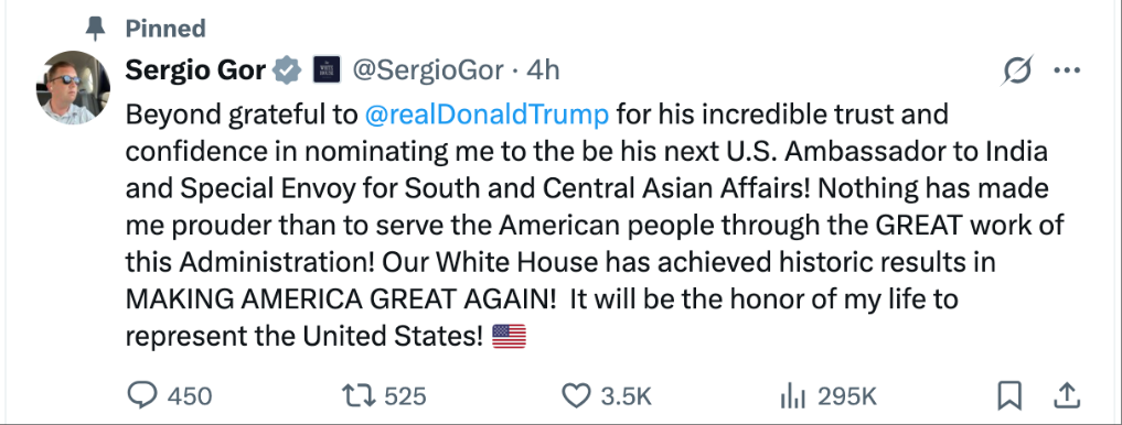 戈爾感謝特朗普提名他為駐印度大使並將該帖文置頂。