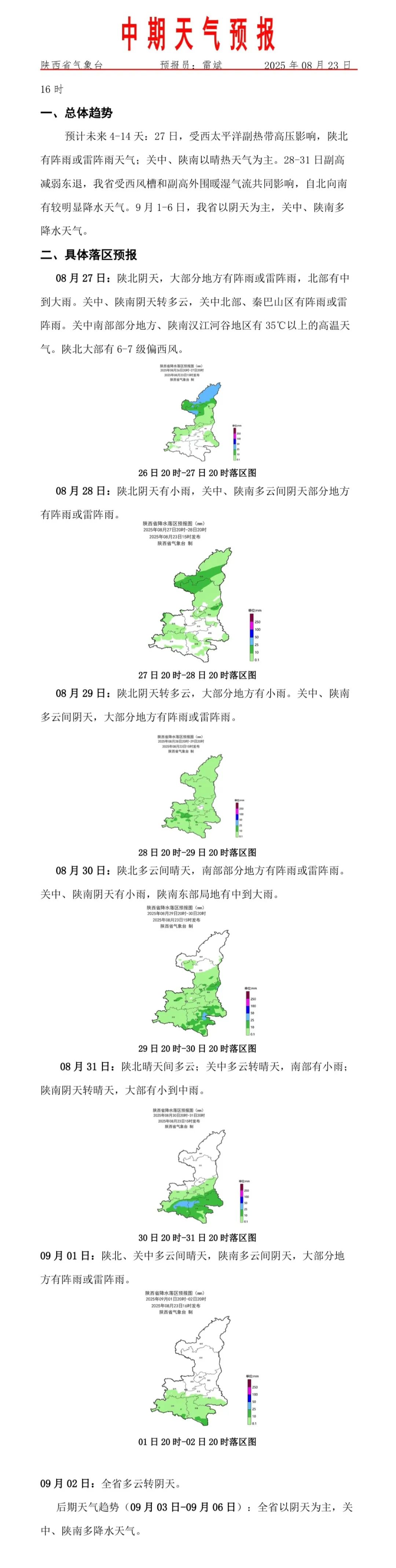 預計未來4-14天:27日,受西太平洋副熱帶高壓影響,陝北有陣雨或雷陣雨天氣;關中、陝南以晴熱天氣為主。28-31日副高減弱東退,我省受西風槽和副高外圍暖濕氣流共同影響,自北向南有較明顯降水天氣。9月1-6日,我省以陰天為主,關中、陝南多降水天氣。