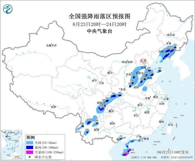 預計,8月23日20時至24日20時,四川盆地西部和南部、雲南中西部、陝西南部、山西東部和南部、河南北部和西部、河北中南部、山東北部、遼寧中東部、吉林東南部、海南島大部、廣東西南部、廣西南部等地部分地區有大到暴雨,其中,海南島東部和南部、四川盆地南部、雲南中部、遼寧東北部、吉林東南部等地局地有大暴雨(100~200毫米)。上述部分地區伴有短時強降水(最大小時降雨量20~50毫米,局地可超過60毫米),局地有雷暴大風等強對流天氣。
