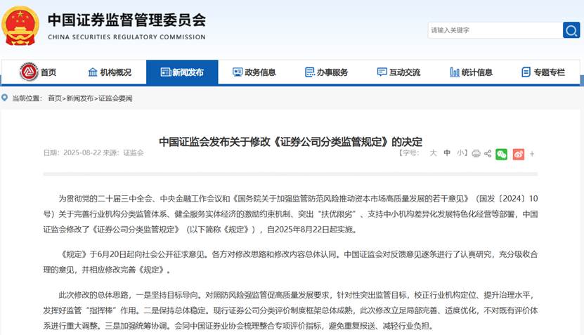 【環球網財經綜合報道】8月22日,證監會發布《關於修改〈證券公司分類監管規定〉的決定》。此次修改將標題由《證券公司分類監管規定》調整為《證券公司分類評價規定》(下稱《分類評價規定》),與以分類評價為主的規定內容相適應。《分類評價規定》自2025年8月22日起實施。