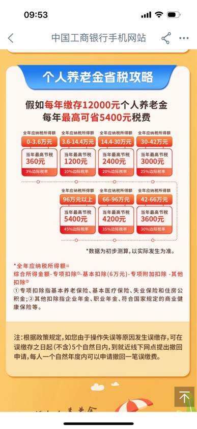 此外,國家對個人養老金實施税收遞延的優惠政策,即在向個人養老金賬户繳存資金和投資過程中獲得的投資收益暫不繳納個人所得税,在最終領取個人養老金時按國家規定的個人所得税最低一檔税率繳税。工商銀行APP顯示,假如一人每年繳存12000元個人養老金,每年最高可省5400元税費。