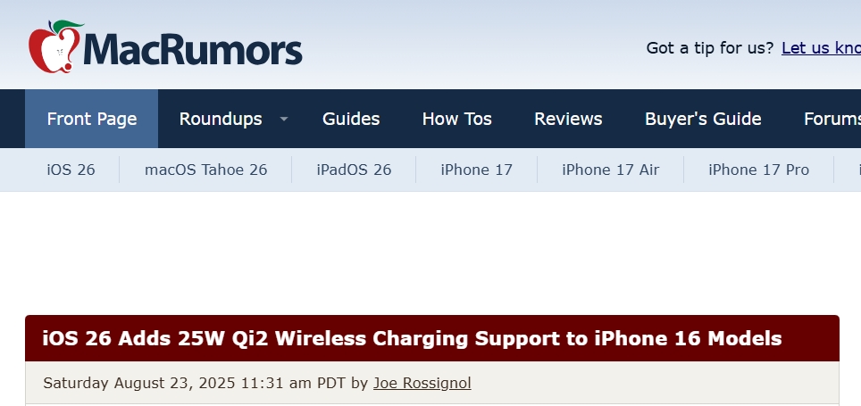 外媒稱,運行iOS 26 的 iPhone 16、iPhone 16 Plus、iPhone 16 Pro 和 iPhone 16 Pro Max 機型可使用任何 Qi 2.2 充電器進行無線充電,充電功率最高可達 25W。此前,這些設備只能使用最新版 MagSafe 充電器實現 25W 無線充電,而第三方 Qi 充電器的充電功率最高也只有 15W。