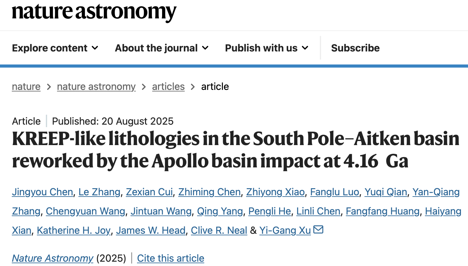【環球網科技綜合報道】8月25日消息,據《自然-天文學》(Nature Astronomy)報道,中國科學院院士、中國科學院廣州地球化學研究所研究員徐義剛團隊聯合大灣區科研團隊及國外合作者,通過對嫦娥六號月壤樣品的高精度年代學研究,首次精確測定月球阿波羅盆地形成於41.6億年前。這為揭示月球遭受太陽系內“撞擊風暴”即晚期重轟炸提供了關鍵證據。
