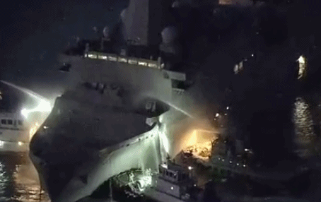 據日本廣播協會(NHK)報道,該艦事發時正在日本沖繩縣宇流麻市的美軍設施“白灘”附近海域。美國海軍在此次火災中曾反覆請求日本海上保安廳的支援。日本海上自衞隊、日本海上保安廳都參與了滅火作業。現場視頻顯示,兩艘消防拖船分別位於艦艏兩側,向艦艇噴水。