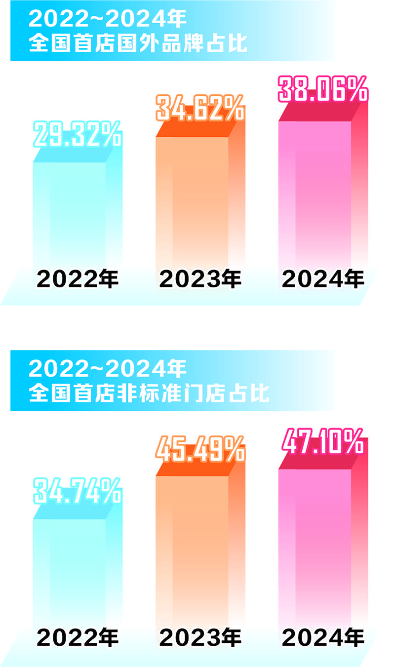 與此同時,新開首店中,國外品牌佔比持續提升,成為首店經濟的重要組成部分。根據贏商大數據監測,2022年,國內新開首店中,國外品牌佔比29.32%;到2024年,這一數據上升至38.06%,增長近10個百分點。越來越多的海外企業來華開設品牌首店,以實際行動對中國市場投下“信任票”。