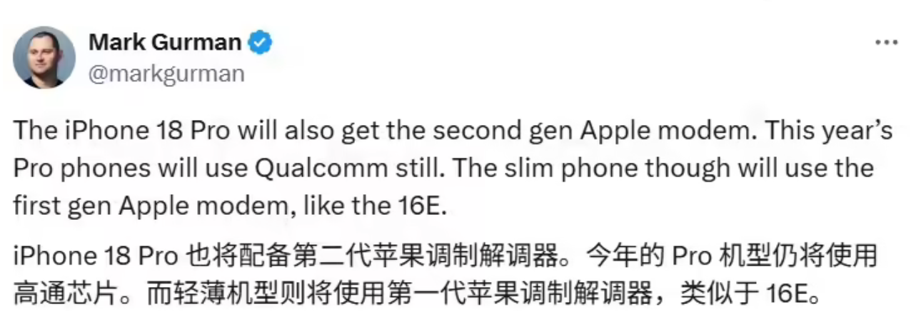 古爾曼透露,蘋果的自研基帶戰略已進入倒計時階段,iPhone 18 Pro將成為首款搭載第二代C2基帶的機型,其下行速率可達6Gbps,並首次支持5G毫米波技術,補齊此前自研基帶在高速網絡性能上的短板。