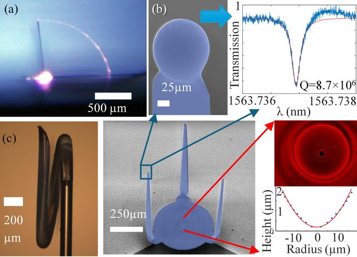 現有的3D打印機制成的三維結構比較粗糙,光學性能不足,無法滿足高性能需求。此次,團隊受到松果鱗片向外彎曲以釋放種子的啓發,利用激光誘導的方式,觸發超薄玻璃片精確彎曲,從而製備出高透明度、超光滑的三維微型光子器件。