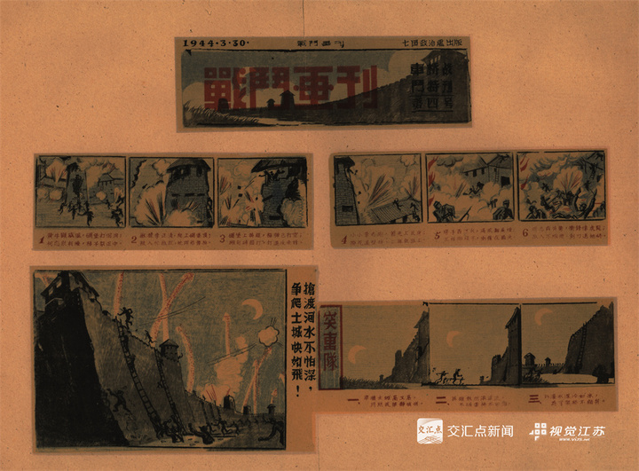 “車橋戰役主題連環畫”生動還原了車橋戰役的激烈戰鬥場景,極具視覺衝擊力。畫面中硝煙瀰漫,將日軍猝不及防的狼狽姿態與新四軍戰士智勇雙全的戰鬥形象展現得淋漓盡致。它用最樸素的敍事將戰術細節與英雄氣概傳遞給軍民,既是鼓舞士氣的精神號角,更是記錄抗戰微觀史的真實切片。