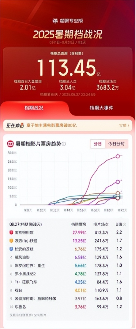 2025年暑期檔電影總票房突破113億元 觀影人次超3億創同期佳績