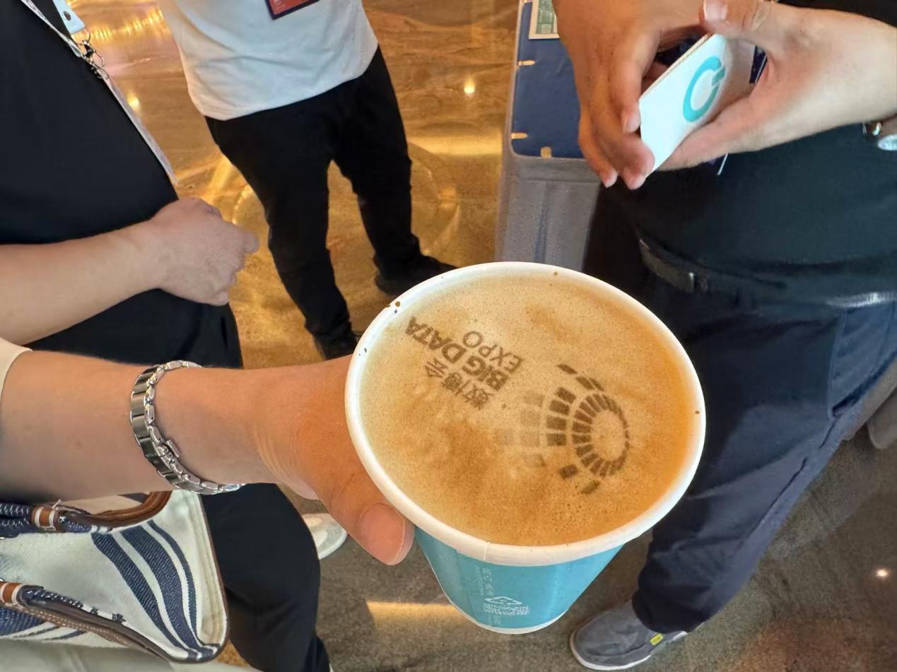 據現場工作人員介紹,這是由上海氦豚機器人科技有限公司設計生產的第6代COFE+全智能機器人咖啡館。“它是全球第一款第6代咖啡機器人,創下單日產能1000杯以上仍能近乎0誤差的世界紀錄,杯杯飲品都能實現複製人類咖啡冠軍精湛手藝,最多可以製作350種飲品,一次加料可以製作300杯以上。”令人嘖嘖稱奇的是,COFE+3D打印的奶泡上不僅能精準呈現數博會的宣傳圖樣,還能打印出自己的照片,讓每一杯咖啡都成為獨一無二的“數博會周邊”。