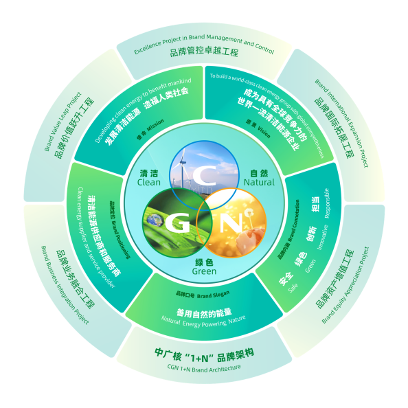 中廣核還系統發佈了完整的品牌理念體系模型。基於“清潔能源供應商和服務商”的品牌定位,中廣核進一步闡釋了“發展清潔能源,造福人類社會”的品牌使命,描繪了“成為具有全球競爭力的世界一流清潔能源企業”的品牌願景,強化了以“Clean、Green、Natural”為核心的品牌主張,品牌口號“善用自然的能量”生動傳遞了中廣核與自然共生共榮的價值理念。整個體系突顯了以“安全、綠色、創新、擔當”為核心要素的品牌內涵,展現出中廣核堅守核安全生命線、走綠色發展道路、堅持創新是第一動力、堅持勇於擔當為國盡責的堅定承諾。