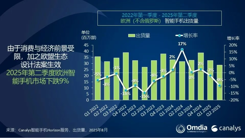 機構:2025年第二季度歐洲智能手機市場出貨量下降9%