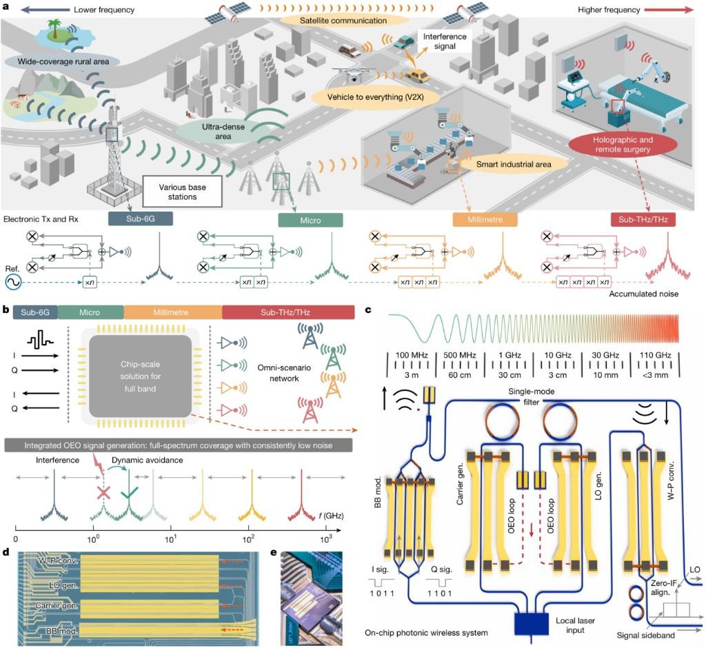 相比傳統基於倍頻器的電子學方案,該片上OEO系統首次實現了0.5GHz至115GHz中心頻率的即時、靈活、快速重構,跨越近8個倍頻程的低噪聲信號調諧性能,既可調度數據資源豐富、速率極高卻難遠距傳輸高頻段,也可調度穿透性強、覆蓋廣卻容量有限的低頻段,是一次里程碑式突破。