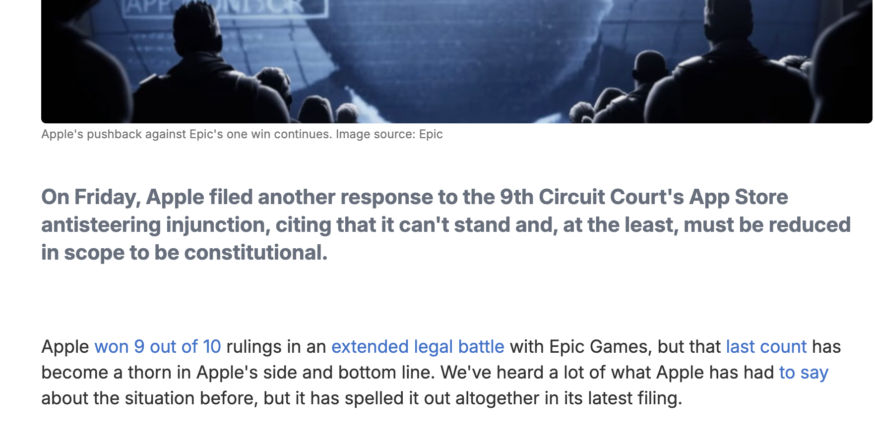 此次爭議源於2020年Epic Games對蘋果發起的反壟斷訴訟。儘管法院最終裁定蘋果未構成壟斷,但判定其禁止開發者在應用內引導用户使用第三方支付渠道或外部網站(即“反引流”政策)的行為違反加州不公平競爭法。2021年,美國地方法院法官伊馮娜·岡薩雷斯·羅傑斯(Yvonne Gonzalez Rogers)頒佈永久禁令,要求蘋果允許開發者在應用內提供第三方支付選項或外部鏈接,並禁止對違反此規則的開發者進行懲罰。