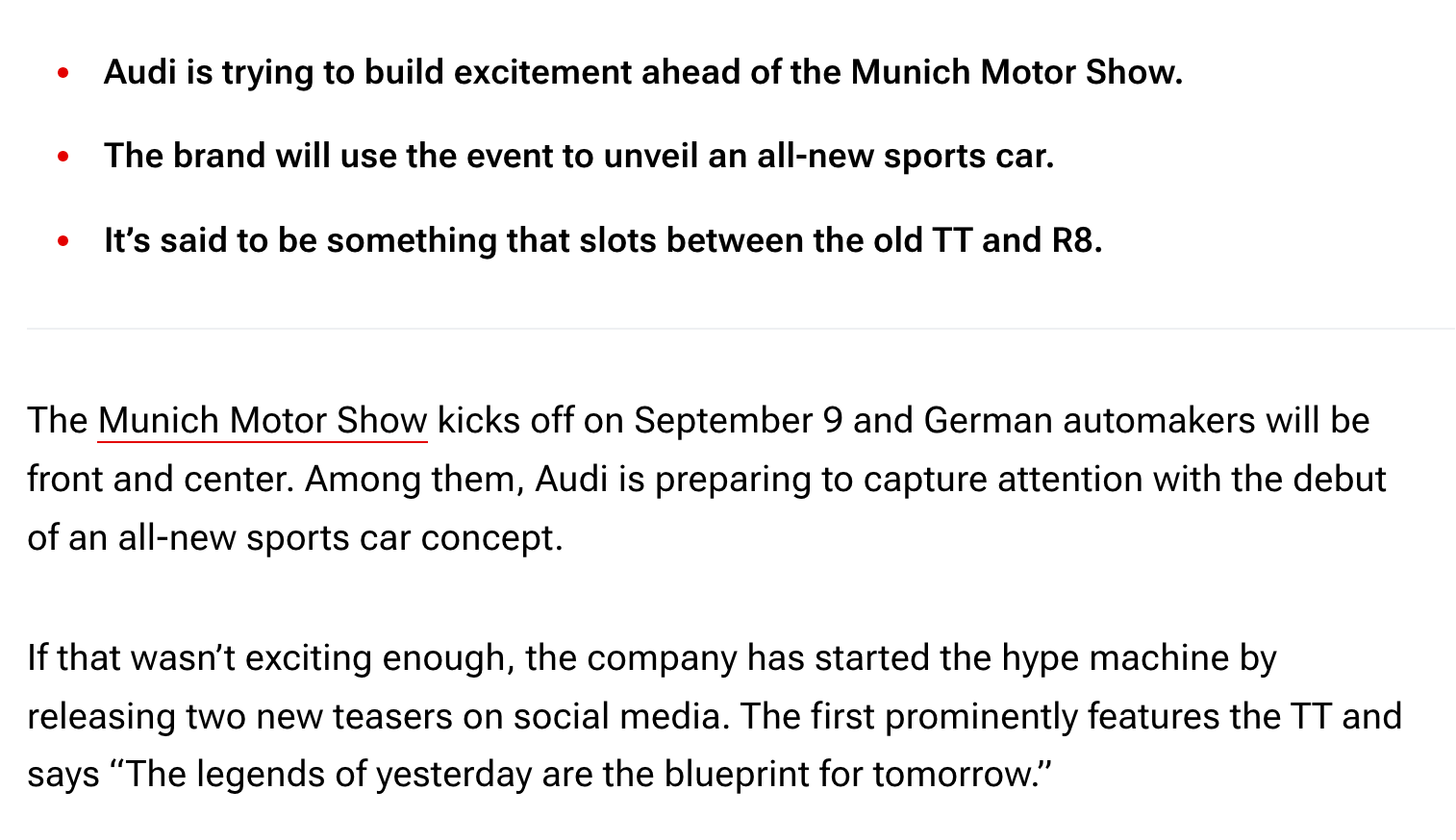 為預熱此次發佈,奧迪官方社交媒體已連續發佈兩段預告視頻。首段視頻以TT經典車型開場,配文“昨日的傳奇是明日的藍本”,隨後畫面切換至奧迪歷史上的標誌性賽車及1991年發佈的Avus概念車,暗示新作將融合品牌賽道基因與未來設計語言。第二段視頻則聚焦車輛動態輪廓,低矮車身與流線型車頂的剪影引發網友對“電動化TT”的猜測。