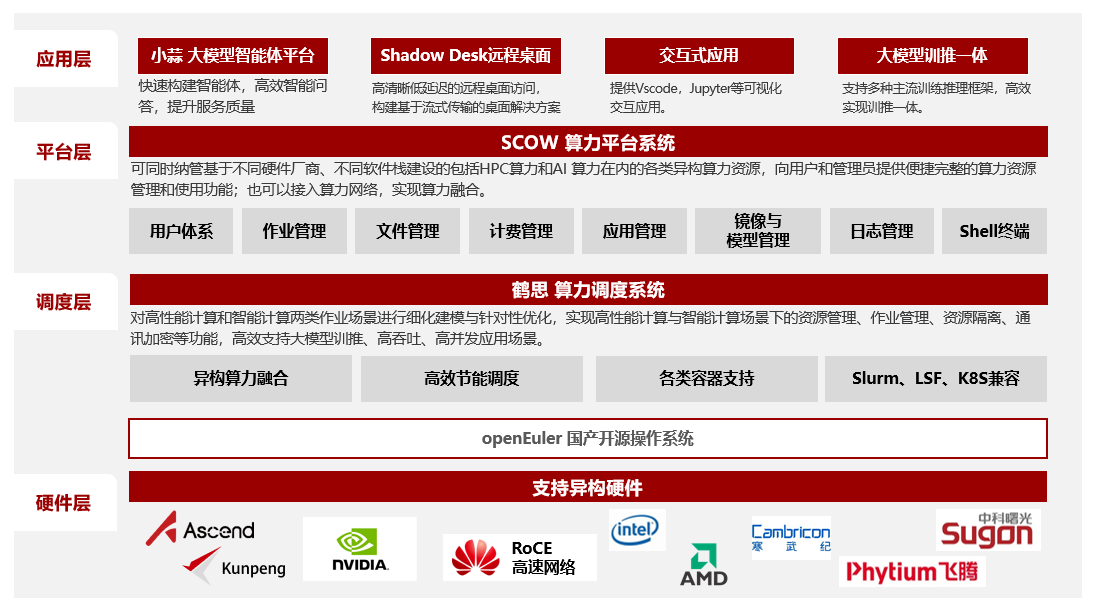 2024年11月依託北京大學鯤鵬昇騰科教創新卓越中心上線的“未名卓越一號”集羣,採用“硬件層—調度層—平台層—應用層”的全棧自主設計:硬件層深度適配鯤鵬CPU與昇騰NPU,兼容openEuler操作系統;調度層以北大自研的“鶴思”算力調度系統為核心,針對高性能計算與智能計算兩種負載進行精細化資源建模;平台層依託SCOW算力平台系統,實現對異構算力的統一納管與門户服務;在應用層,以可視化或命令行的形式提供各類超算智算應用、Shadow Desk遠程桌面、小蒜大模型智能體平台、大模型調度服務平台等面向不同領域和需求的應用,向科研教學場景提供一鍵即用的大模型訓練、推理及可視化開發環境。