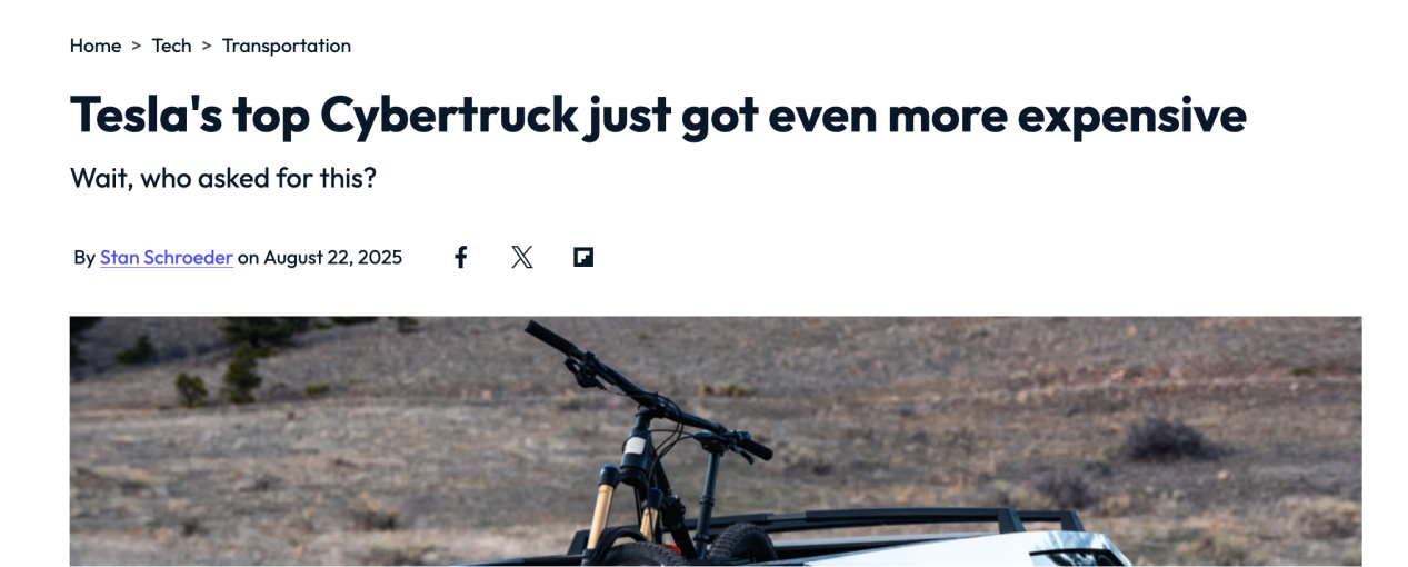 外媒:特斯拉頂配 Cybertruck 價格進一步上漲