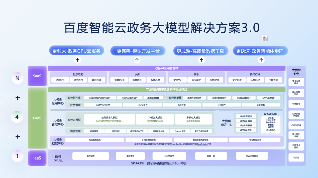 據介紹,百度智能雲政務大模型解決方案 3.0 從算力、數據、模型和應用四個層面全面升級,以 “1 + 4 + N” 架構為政務行業提供高效、安全、智能的模型服務能力。