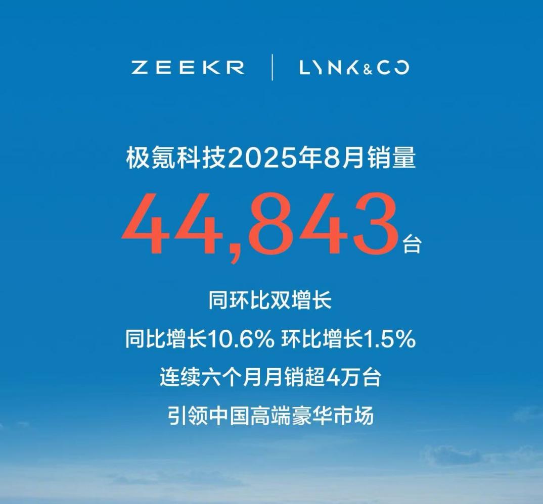 極氪科技8月銷量為44,843台 連續6個月月銷超4萬台