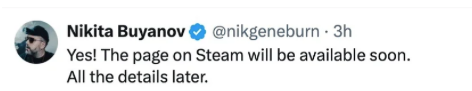此次官宣並非毫無預兆。8月30日,Nikita Buyanov曾在社交平台發佈一張GIF動圖,內容為一名男子用熨斗噴出“蒸汽”,並配以蒸汽雲表情符號,引發玩家對“Steam”平台的猜測。次日,官方團隊進一步發佈推文,僅使用蒸汽雲符號作為回應,最終於8月31日正式揭曉答案。(青山)