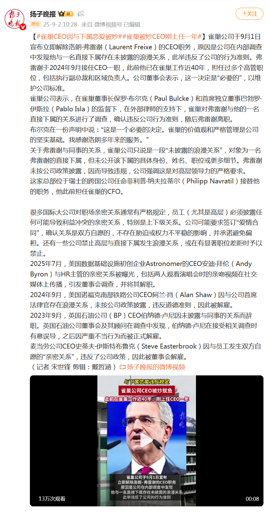 據@揚子晚報 報道,雀巢公司於9月1日宣佈立即解除洛朗·弗雷謝(Laurent Freixe)的CEO職務,原因是公司在內部調查中發現他與一名直接下屬存在未披露的浪漫關係,此舉違反了公司的行為準則。弗雷謝於2024年9月接任CEO一職,此前他已在雀巢工作近40年,擔任過多個高管職位,包括執行副總裁和區域負責人。公司董事會表示,這一決定是“必要的”,以維護公司標準。