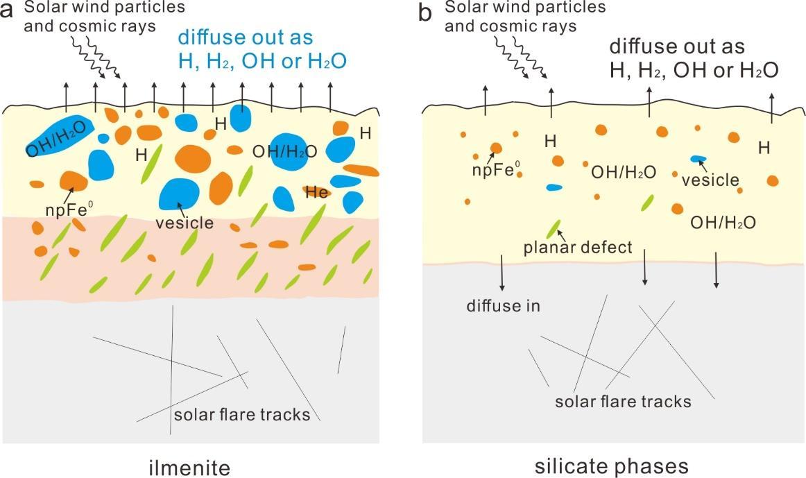 太陽風注入的氫(H)是月表水的重要來源。以往對嫦娥五號月壤中橄欖石、輝石等硅酸鹽礦物的分析發現,這些礦物表層水含量很高,且主要來自太陽風。但近期有遙感觀測顯示,月表水的分佈似乎與鈦的含量有關:低鈦區域含水量通常高於高鈦月海玄武岩區域,且富鈦區域水的日變化更明顯。這一現象在科學界引發了不小的爭議。