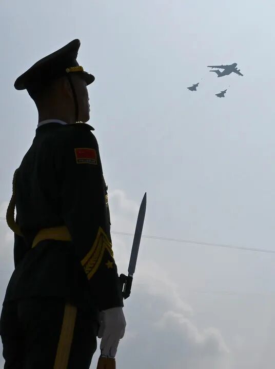 這是空中護旗梯隊從反艦導彈方隊上空飛過。新華社記者 林煜 攝