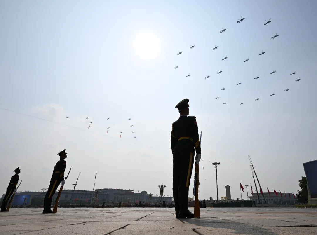 這是空中護旗梯隊通過天安門廣場,3架直-8L運輸直升機分別懸掛“正義必勝”“和平必勝”“人民必勝”條幅。新華社記者 李鋼 攝
