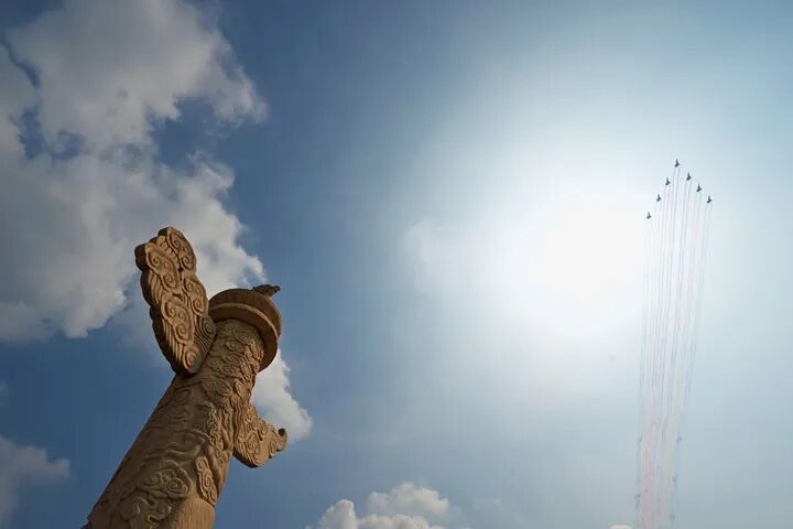 這是教練機梯隊通過天安門廣場。新華社記者 劉穎 攝